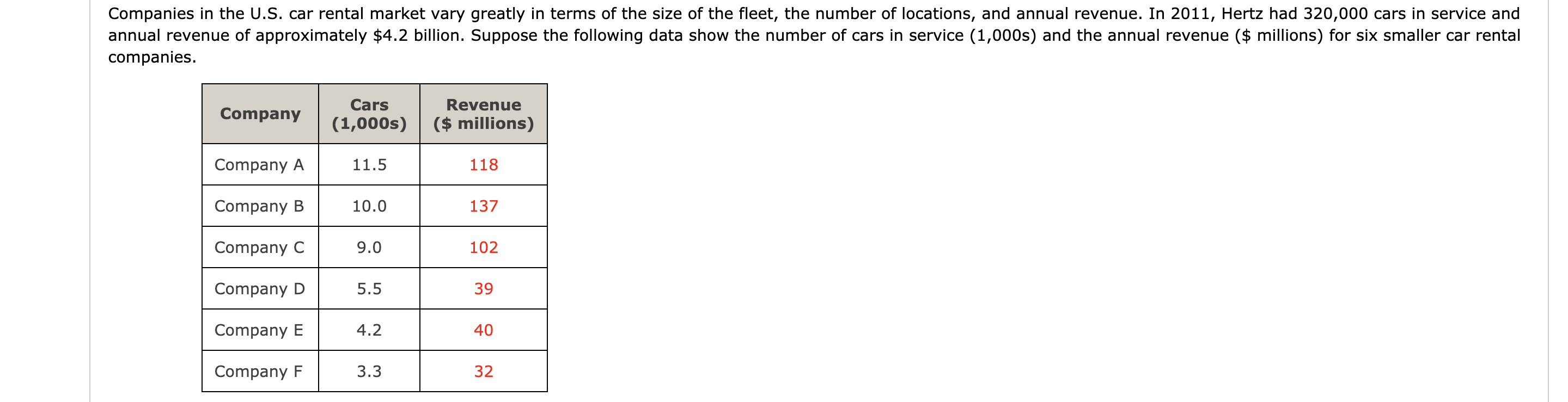 Suppose the following data show the number of cars in service 1000s and the annual revenue millions for six smaller. Car rental market vary greatly in terms of the size of the fleet the number of locations and annual revenue. In 2011 hertz had 320000 cars in service and annual revenue of approximately 42 billion.